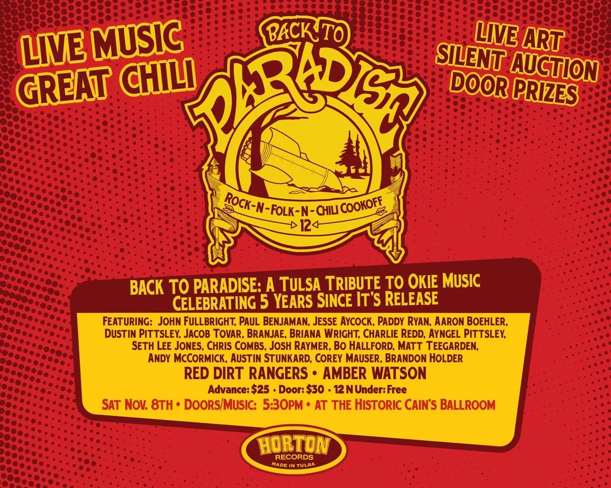 12th Annual Rock-N-Folk-N-Chili Cookoff Saturday, November 8, 2025 7:00 PM 10:00 PM Cain's Ballroom 423 North Main Street Tulsa, OK, 74103 United States (map) Google Calendar ICS Get Tickets HERE!